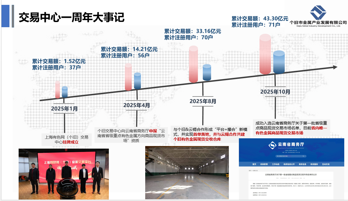 10月23日,在由上海有色网信息科技股份有限公司(SMM)、山东爱思信息科技有限公司以及个旧市产业开发集团有限公司联合主办,云南锡业股份有限公司特邀协办,JFX雅加达期货交易所作为战略合作伙伴,AETI印尼锡出口协会作为协会合作伙伴,广西华锡有色金属股份有限公司、个旧市千岛金属有限公司、惠州联熙电子科技有限公司、红河永森矿业有限公司、上海清算所作为支持单位支持的2025 SMM(第十五届)锡产业链大会上,上海有色网(个旧)金属交易中心总经理杨小楼跟与会嘉宾分享了“技·数驱动,贸·融结合,助力有色产业新生态”。